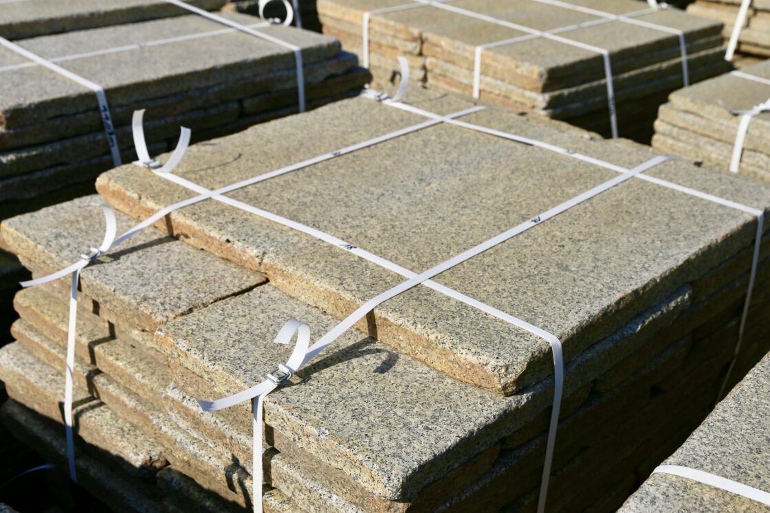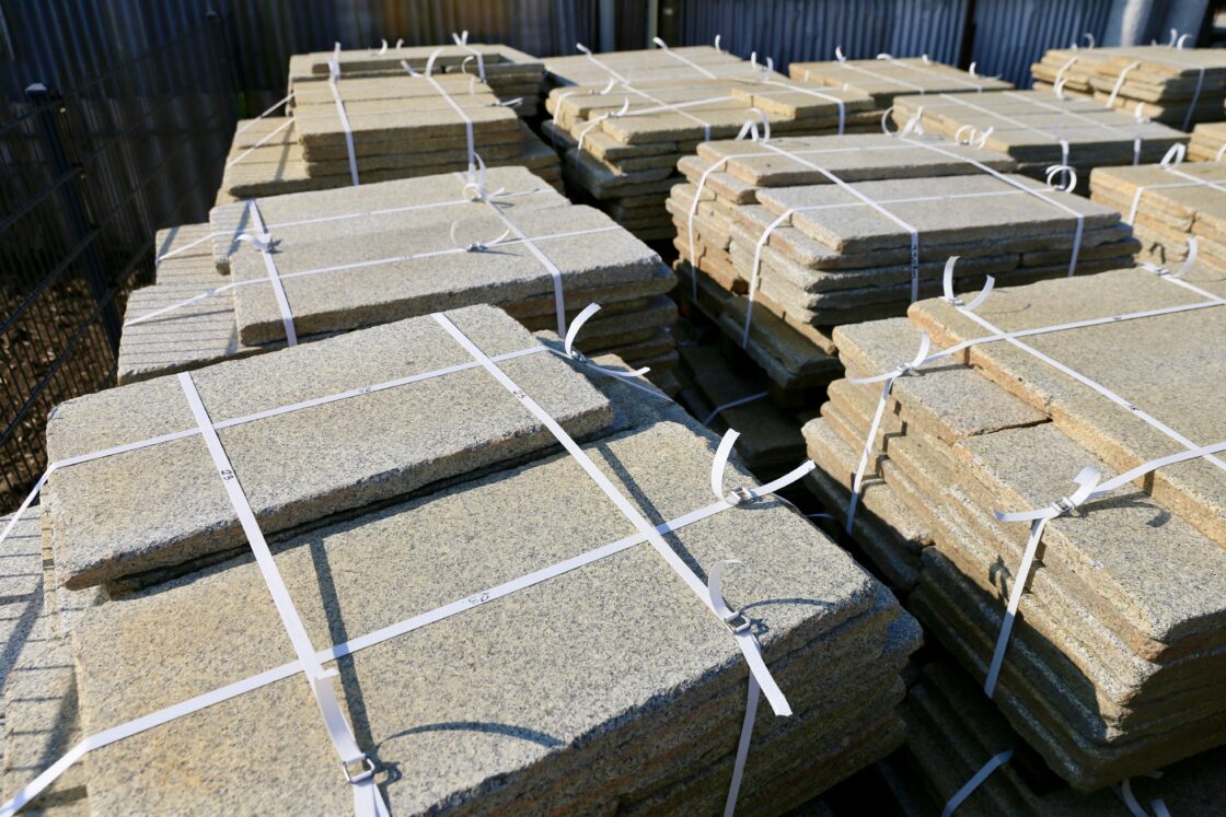 Bräunliche 50er Granitstein-Bahnenplatten, 5 cm Stärke.