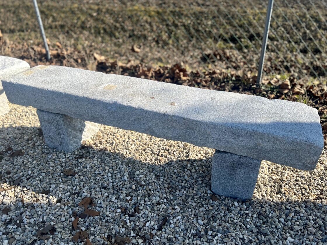 Hier eine Granitstein-Sitzbank mit eher glatter Oberfläche, aus alter Blockstufe gefertigt.