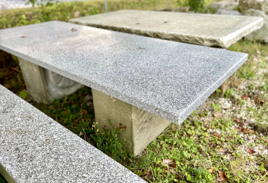 Großer Stein-Tisch mit zwei Sandstein-Sockeln und neuer Granitstein-Platte.