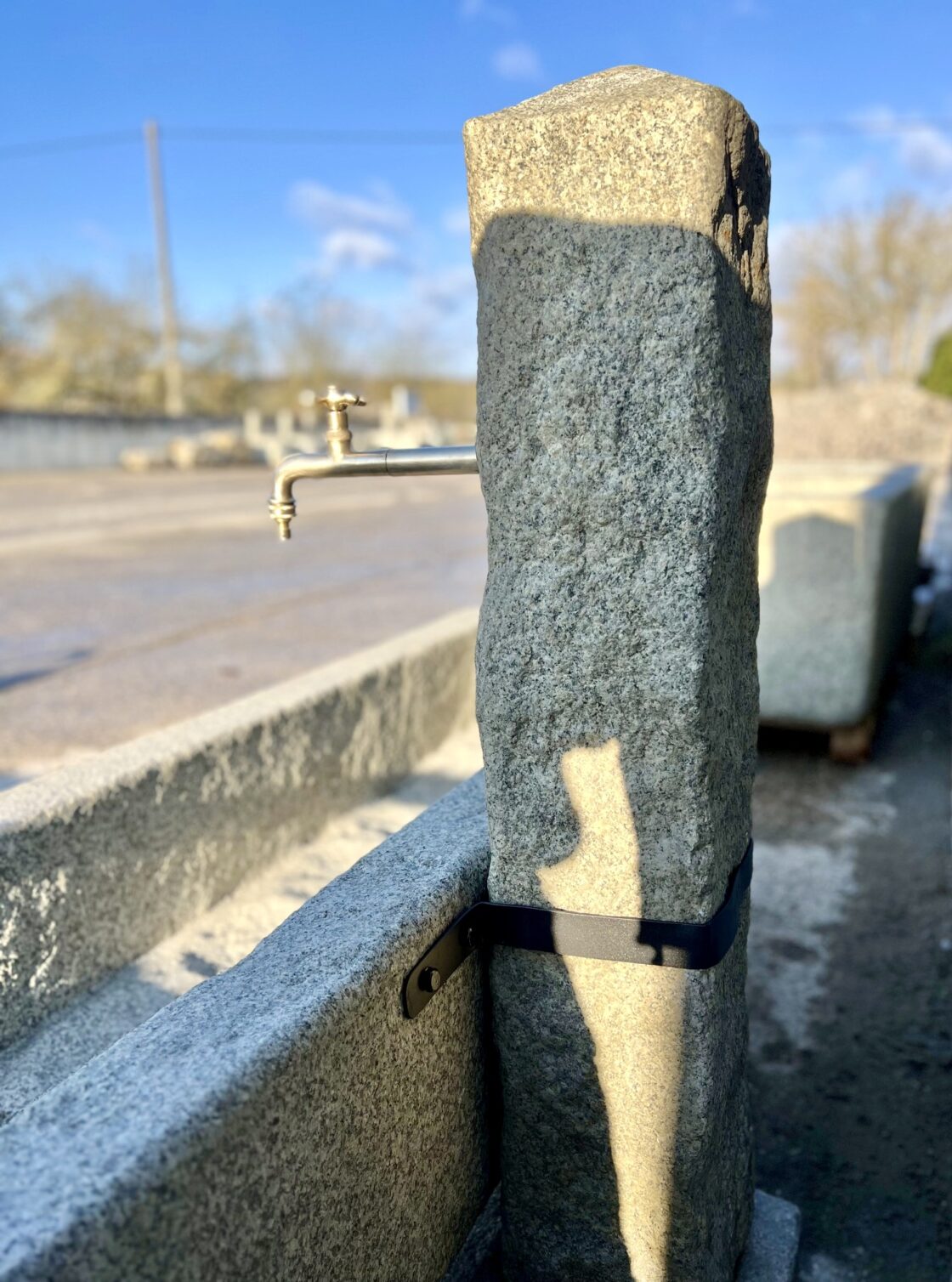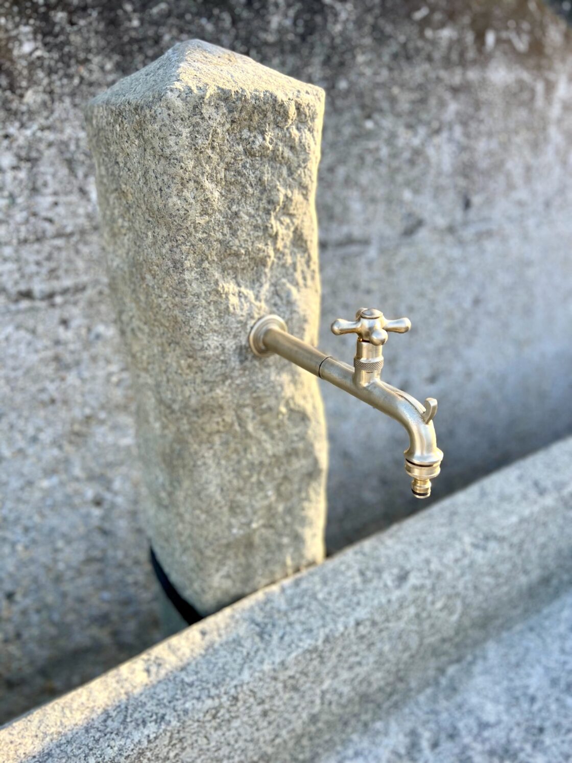 Langer Brunnen aus Granitstein mit Steinsäule und kurzer Messing-Armatur inklusive Gardena-Anschluss, zwei Steinsockeln und Edelstahl-Überlaufrohr.
