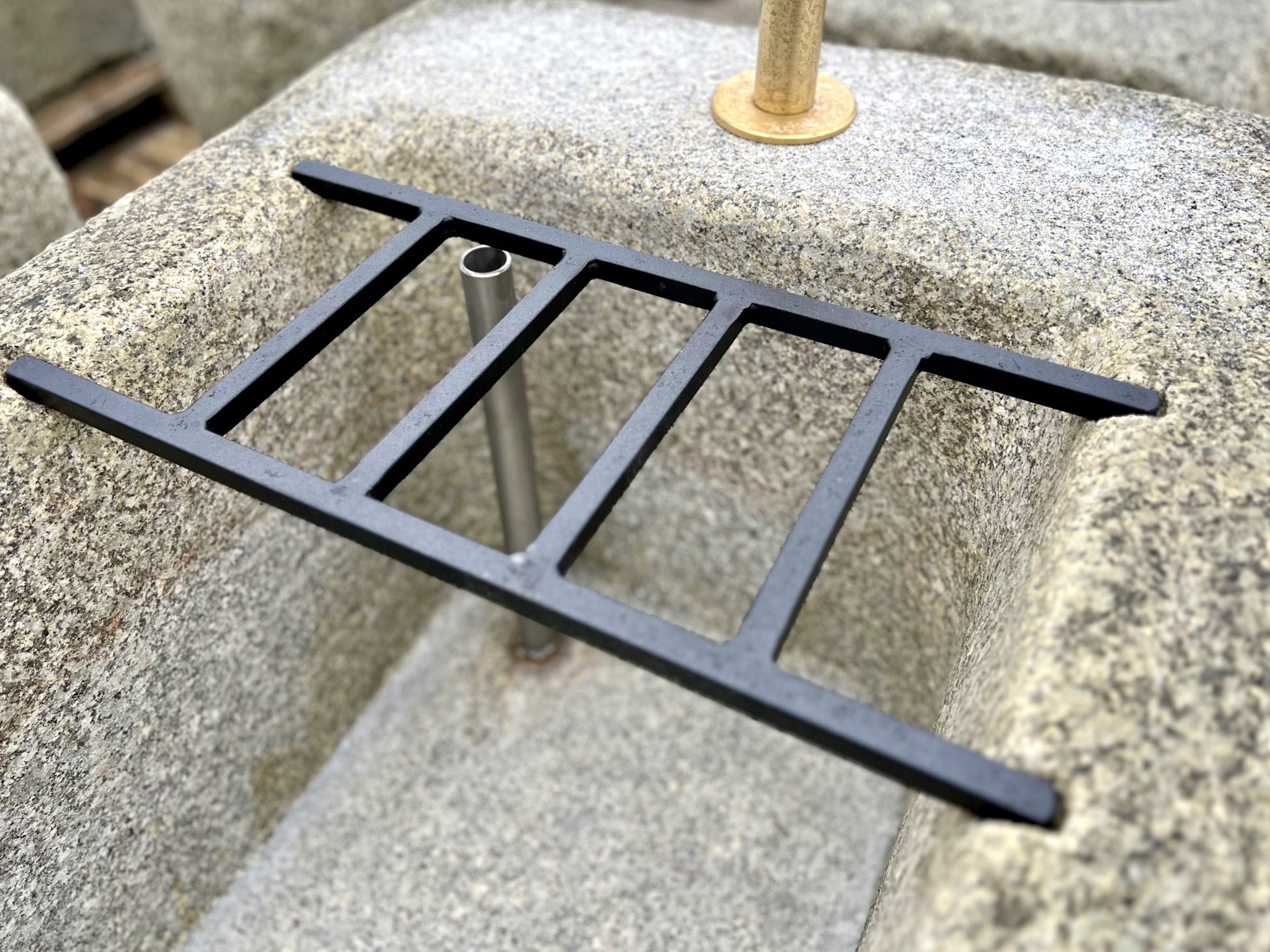 Granitstein-Trog mit Messing-Armatur inklusive verstecktem Gardena-Anschluss, mit kleinem Abstellgitter und Überlauf-Rohr zum einfachen Wechsel des Wassers und Reinigung des Troges.
