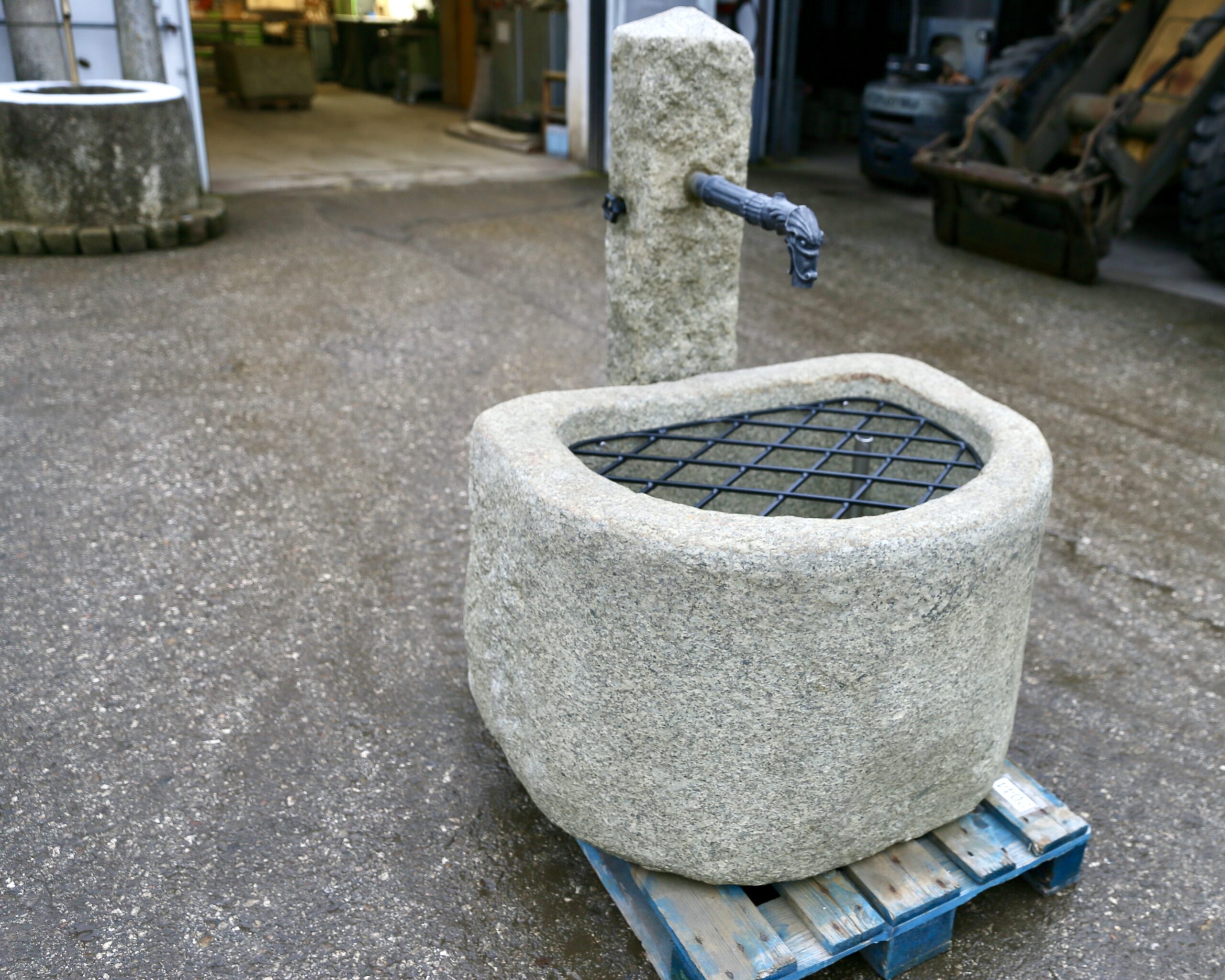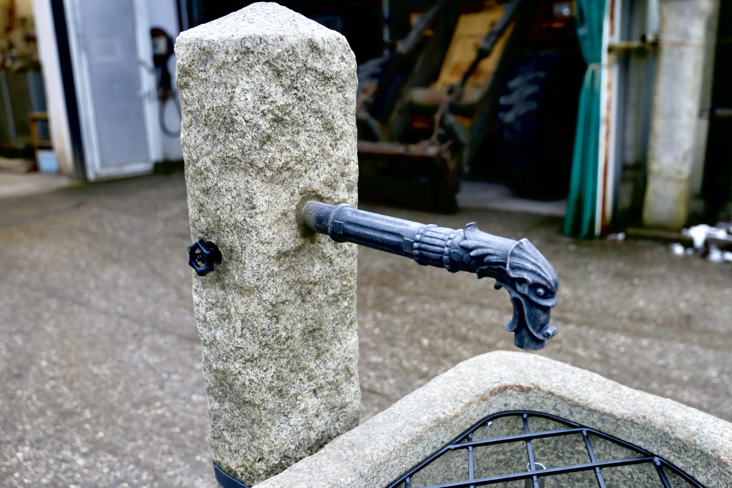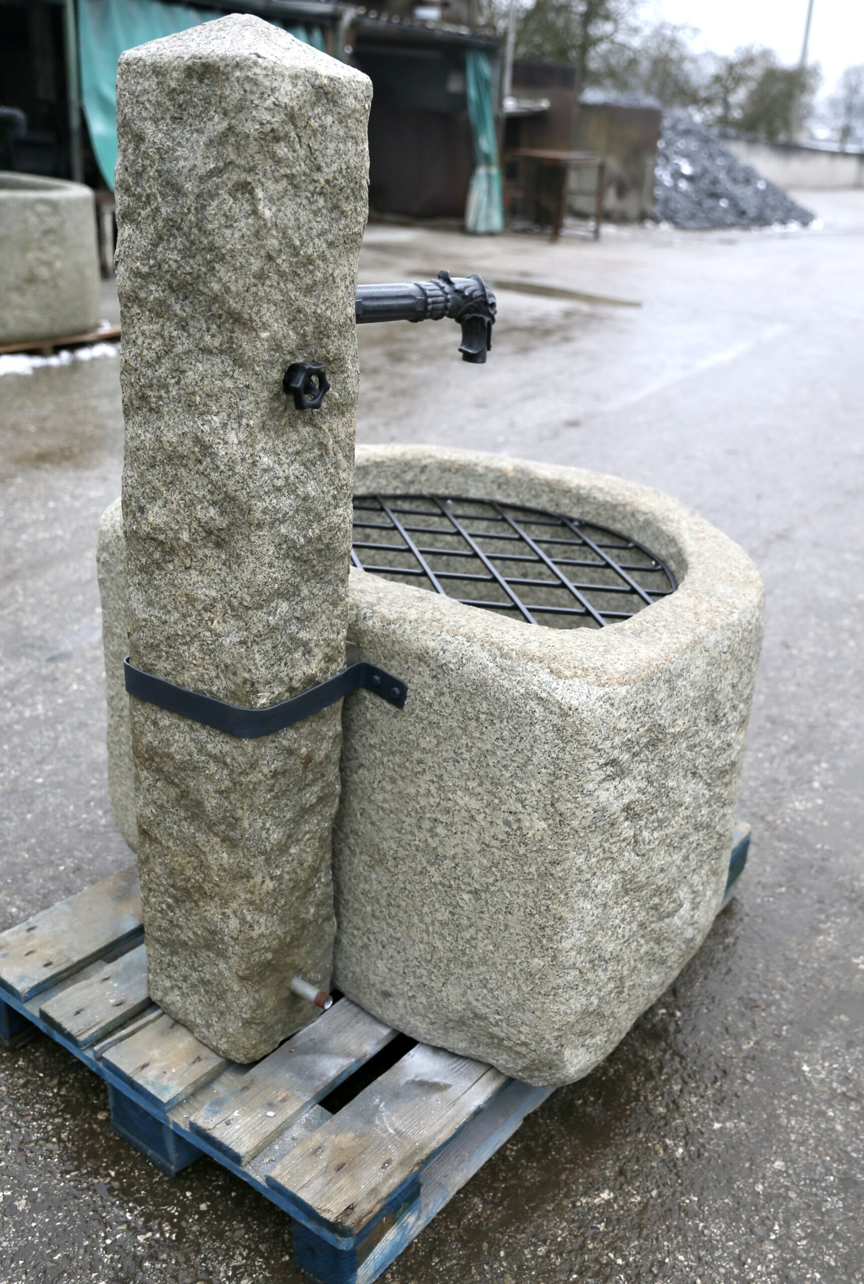 Halbrunder Granitstein-Brunnen inklusive fertig-installierter Brunnensäule mit Ventil und Brunnenrohr in Antik-Optik, mit Brunnengitter und Überlauf-Rohr.