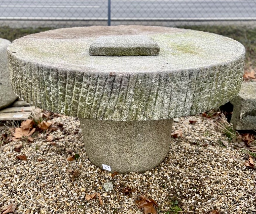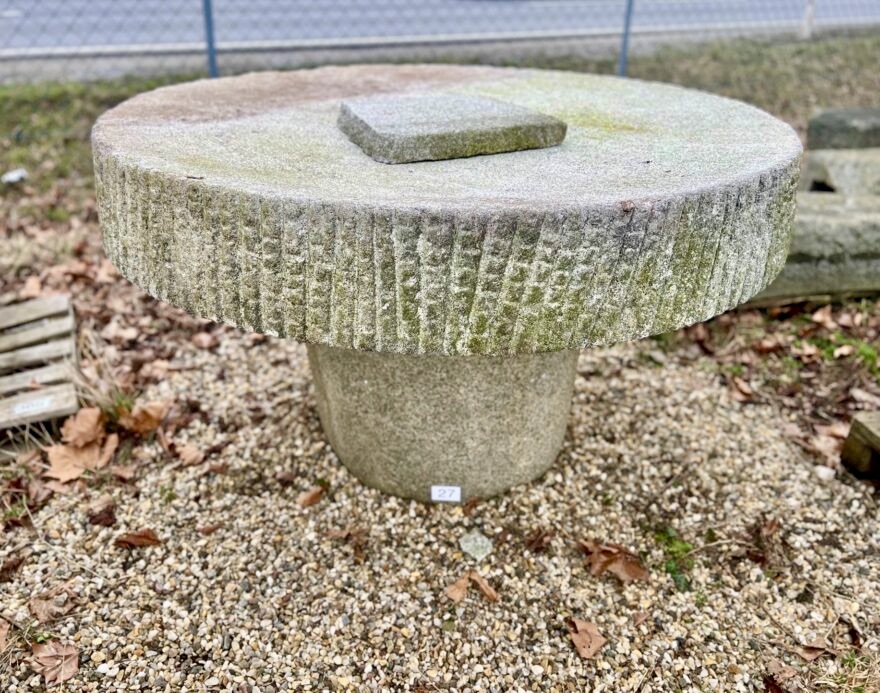 Mühlstein-Tisch, gefertigt aus altem Mühlstein.